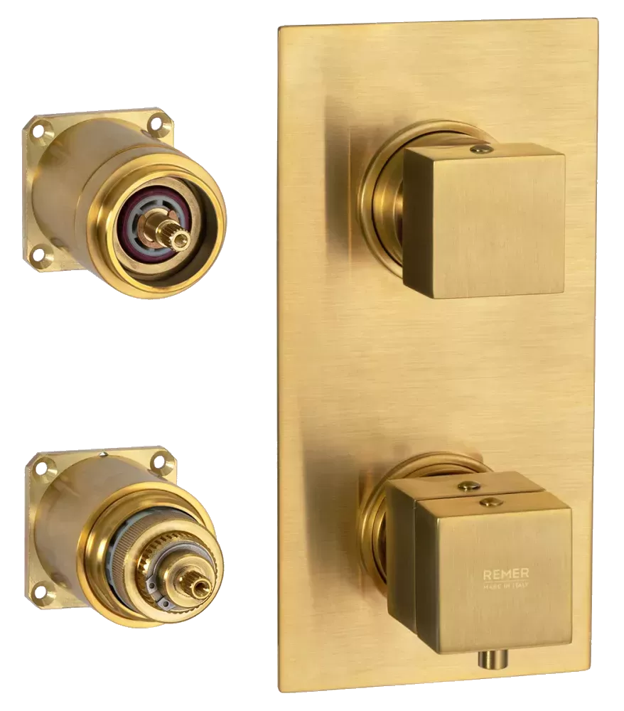 Термостатический смеситель скрытого монтажа REMER Qubika QT93KBBG – это современное решение для ванной комнаты, сочетающее в себе стиль и функциональность. Предназначен для использования с тремя потребителями (лейка верхнего душа, ручной душ, излив в ванну). Цвет брашированное золото (BG) придает смесителю изысканный вид, идеально сочетающийся с различными дизайнерскими решениями.